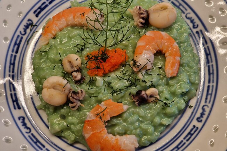 Das Gericht mit Reis und Meeresfrüchten kann als Hauptgang serviert werden. Aber auch beispielsweise als Vorspeise oder Fingerfood in kleinen Portionen serviert kann die blaue Farbe des Risottogerichtes mit der …