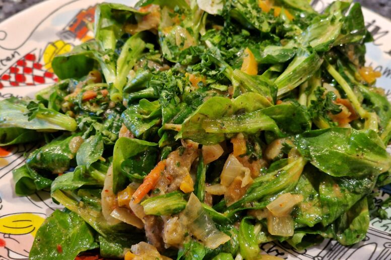 In April kann es bereits eine Menge Feldsalat geben, wir fangen an uns – neben der klassisch norddeutschen Zubereitung als grüner Salat mit Joghurtsauce – nach vielen weiteren unterschiedlichen Rezepten …