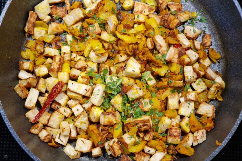 Die besondere Gewürzvielfalt der indischen Küche kann auch dem Knollensellerie einen neuen Geschmack verleihen, wie in diesem vegetarischen Gericht, das den Sellerie ähnlich wie Bratkartoffeln angebraten und fast ohne Sauce …