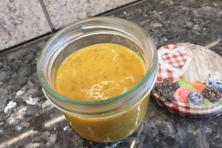 Ein Blitzrezept Zutaten 2 Esslöffel mittelscharfer Senf 2 Esslöffel Honig 1 Esslöffel frische Dillspitzen, gehackt (alternativ 1 Teelöffel getrocknete Dillspitzen) Zutaten zusammen mixen – fertig.