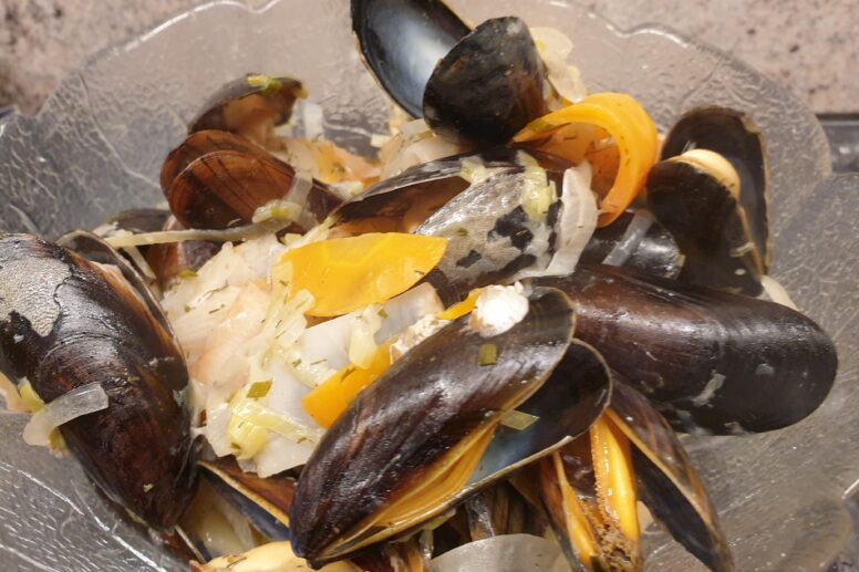 Eine andere Variante für Miesmuscheln in klarem Sud, die Zutaten sind diesmal für 8 Portionen gedacht. Zutaten Gemüse und Knoblauch fein schneiden und in etwas Butter anbraten, dabei Lauch und …