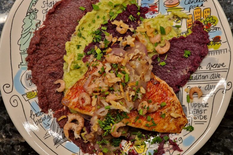 Garnelen auf Meerbarbenfilet auf Püree vom Rot- und Rosenkohl