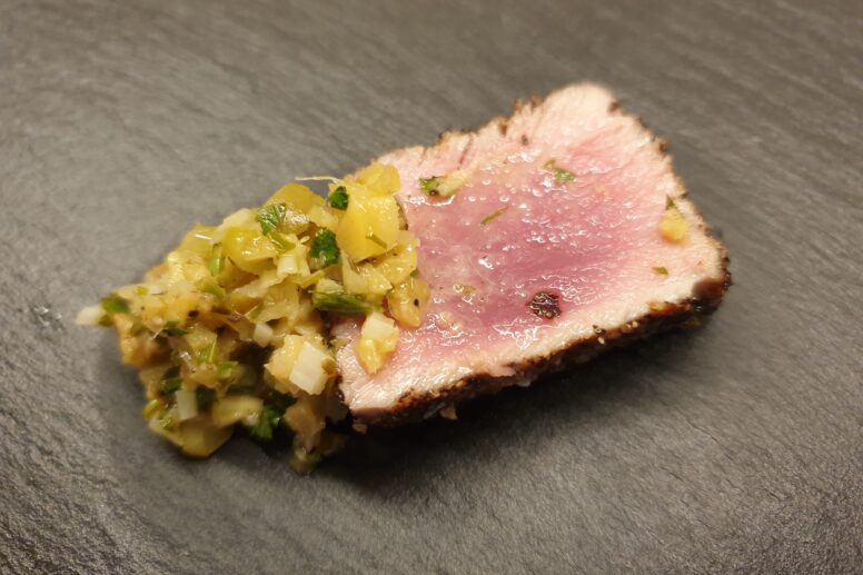 Frisch muss er sein, der Thunfisch, und sehr kurz gebraten, dann wird es ein Leckerbissen … Zutaten 2 Thunfischfilets 3 Teelöffel schwarzen Pfeffer, frisch gemahlen 1 fingerlanges Stück Ingwer, sehr …